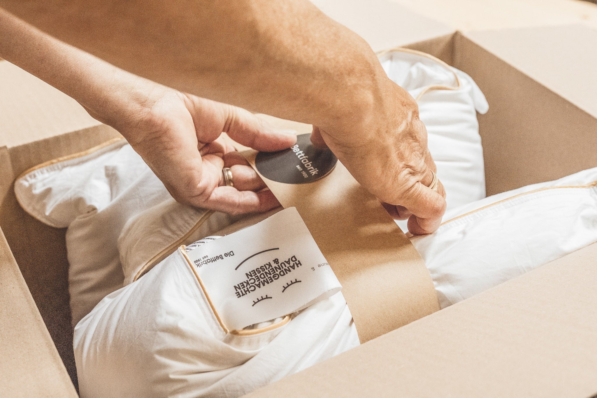 Verpacke deine alten Daunenprodukte (egal ob Kissen, Daunenjacke etc.) in einen dafür geeigneten Karton. Du kannst die Produkte auch etwas quetschen, um so Platz zu sparen.